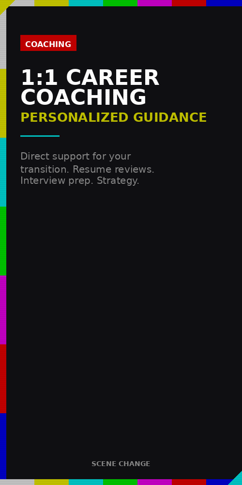 Two Reasons First, I actually read your materials, give real feedback, and show up prepared—which means I can't take on dozens of clients at once. Second, and more importantly: I prioritize maintaining my corporate client portfolio. That's deliberate. Scene Change is founded by someone who's actively working in the environment you're trying to enter, not someone who left years ago and is now selling coaching. Staying in corporate work limits my coaching capacity, but it keeps my insights current and my credibility real.